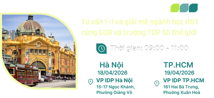 Gặp gỡ trực tiếp đại diện trường hàng đầu tại Úc là Go8 và các trường Top 50 thế giới, được giải đáp mọi băn khoăn về học bổng, ngành học, điều kiện đầu vào...