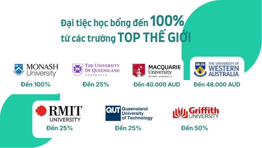 Săn học bổng giá trị đến 100% từ các trường Go8 và trường TOP 50 thế giới về đào tạo các ngành HOT như Kinh doanh, Kế toán - Tài chính, Khoa học máy tính, Kỹ thuật, Giáo dục, Truyền thông, Công nghệ, Sức khỏe, Nhà hàng - khách sạn, Quản trị sự kiện...